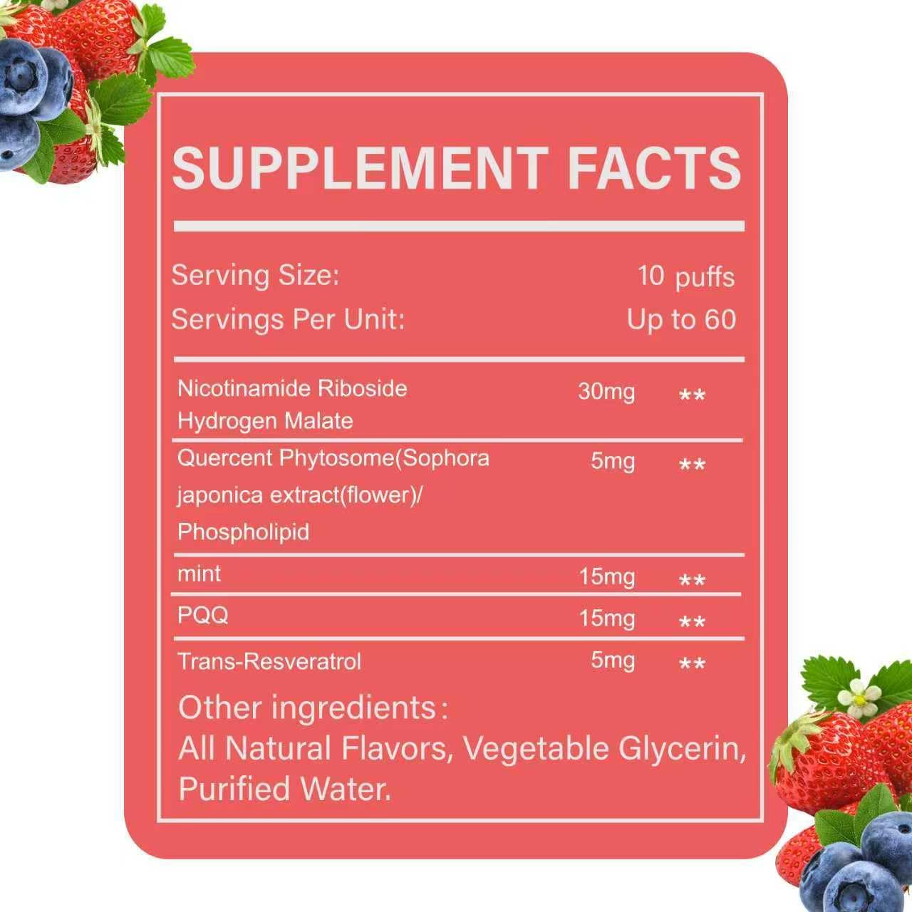 NAD+ precursors, mullein leaf, eucalyptus, peppermint, and thyme — all food-grade and third-party tested. Zero nicotine, zero tobacco, zero propylene glycol, zero vitamin E acetate, zero artificial flavors. COA available on request.